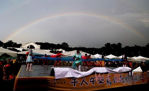 千人午餐雖然冒雨登場,但連串的詹姆士樂團表演、茶山風情繁花盛開南投舞蹈演出、營北國中的祥龍獻瑞、旗開得勝等等都為活動憑添許多趣味及歡樂,尤其是營北國中舞龍表演時,微雨的天際還乍現七彩虹橋,更讓參加民眾驚豔不已。(圖/記者石振賢翻攝.2023.10.08.)