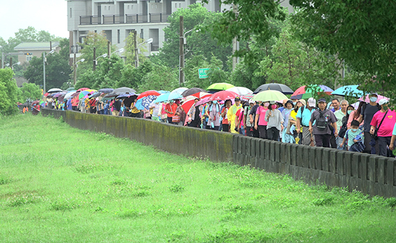 (觀傳媒宜蘭新聞)【記者陳俊傑/宜蘭報導】由宜蘭縣政府主辦育才國小承辦的「112年宜蘭縣國民體育日全民健行活動」今(8)日上午在羅東運動公園棒球場前廣場展開,數以千計的參與民眾沿著安農溪畔至分洪堰,折返後行經分紅橋、安農溪分洪堰公園,返回棒球場。由於天空下著雨,民眾撐傘冒雨前進,形成傘花朵朵開的景象。