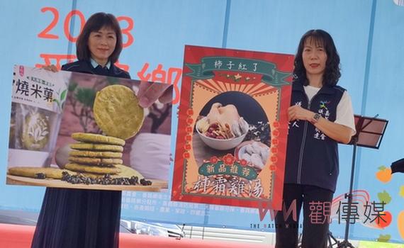 (觀傳媒嘉義新聞)【記者任禮清、邱嘉琪/嘉義報導】秋天的柿子,就是一樹風景,滿樹的柿子璀璨艷黃,產量全國最高的嘉義縣番路鄉,今年柿子產量豐收,果實碩大甜美,番路鄉農會籌備滿滿整月柿子季推廣促銷,更14、15日飲冰柿茶集旁廣場盛大舉辦新產品上市發表,「柿霜雞湯即食料理包」與月底上市的「茶燒米菓」,由議長夫人黃瓊賢與番路鄉農會總幹事趙幸芳共同代言,宣告番路鄉特產柿子的推廣開發日益精進,活動並頒獎嘉義縣大阿里山茶區半球型包種茶製茶技術競賽得獎者。