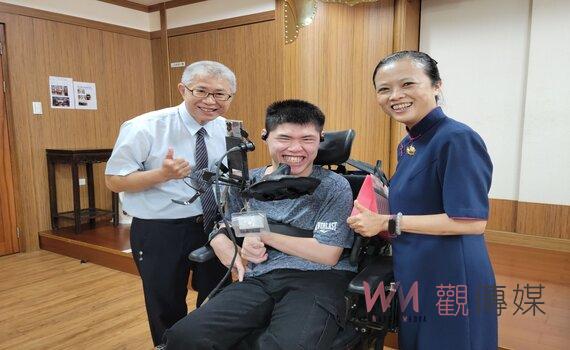 大專組獲獎人方正法目前是大學二年級學生,腦麻的他靠嘴唇打字、操作滑鼠,完成每項作業及報告,方正法堅持向上的的努力,上台鼓勵大家。