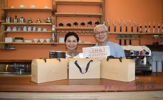 (觀傳媒雲林新聞)【記者洪佳伶/雲林報導】隱藏在雲林縣北港鎮巷弄內,位於文昌路上的季節咖啡,由時尚五金藝術大師田高瑞與鋼琴老師劉季宜賢伉儷,共同為追求無毒農業築夢,自創品牌Season Cafe季節咖啡店,夫妻倆愛喝咖啡,從種植到烘焙打出個人品牌咖啡,近日榮獲台灣百大伴手禮,雲林縣副議長蔡咏鍀、北港鎮民代表主席黃美蘭,致贈紅榜恭賀,夫妻驚喜於自己咖啡作品入選台灣百大伴手禮,也讓咖啡店溫馨飄香。