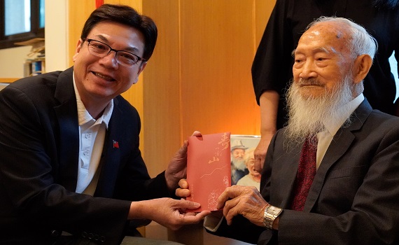(觀傳媒新北新聞)【記者蔡宇辰/新北報導】重陽節將至,新北市副市長劉和然21日特別準備重陽禮金、蘋果禮盒及金鎖片,在社會局長李美珍、五股區長藍瑞珉和新北市榮民服務處長林振生等人陪同下訪視百歲人瑞鄧集成。劉和然表示,市府將持續營造讓長者安居樂業的樂活城市,祝福每位長輩重陽佳節快樂,身體健康、平安順心。