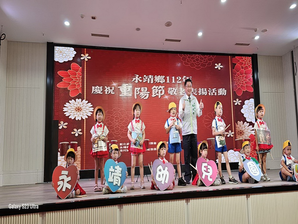 ▲慶賀阿公阿嬤得獎,永靖鄉立幼兒園在重陽節表揚活動賣力表演。