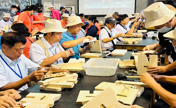 下午前往車埕車站環湖聚落參觀,車埕位於南投縣水里鄉明潭壩頂下方,在日治時期曾經因興建大觀發電廠以及木材業而興盛一時,為運送發電工程所需的設備、原料及南投木材,早期的車埕,是一人力台車的轉運站,在當時可是南投木材的重要集散地,人車總是絡繹不絕、熱鬧非凡,使得水里車埕一帶被稱為「小台北」,可見車埕當時的繁華盛況。一行人欣賞山林湖畔美景,呼吸大自然芬多精,隨後前往林班道體驗工廠,進行木椅製作體驗活動,參與的榮民都感到十分新奇又有趣,做好的木椅還可以帶回家紀念,非常具有成就感!