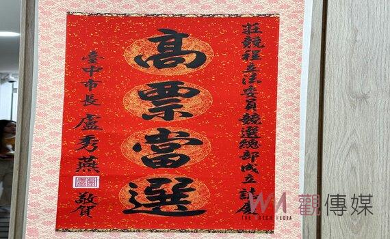 (觀傳媒中彰投新聞)【記者廖妙茜/台中報導】距離2024立委選舉只剩下70多天,台中市民進黨立委莊競程競選總部,最近收到市長盧秀燕送來的中堂,祝賀「高票當選」,對此,莊競程表示,心懷感恩,將為選民繼續努力打拚,讓北北屯變得更好。