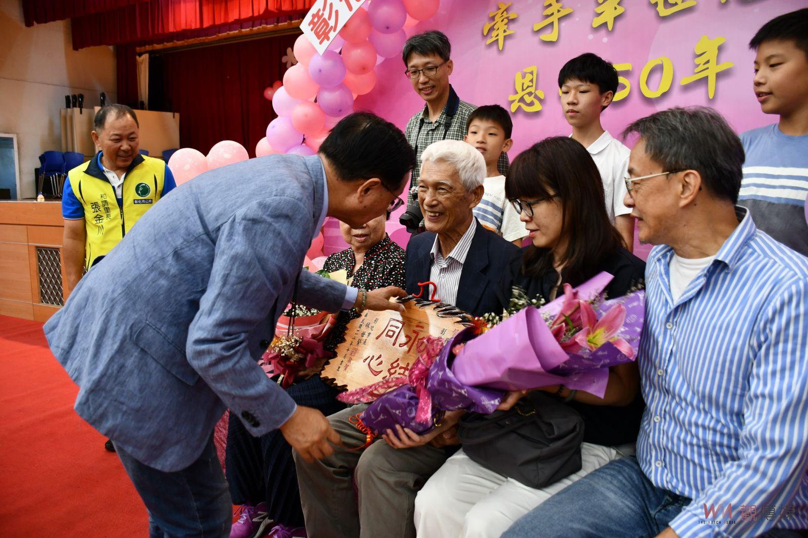 ▲彰化市「九九重陽節」系列活動在壓軸好戲中,在彰化生活藝文館舉行的表揚活動,由市長林世賢表了290對金婚夫婦,場面隆重又溫馨。