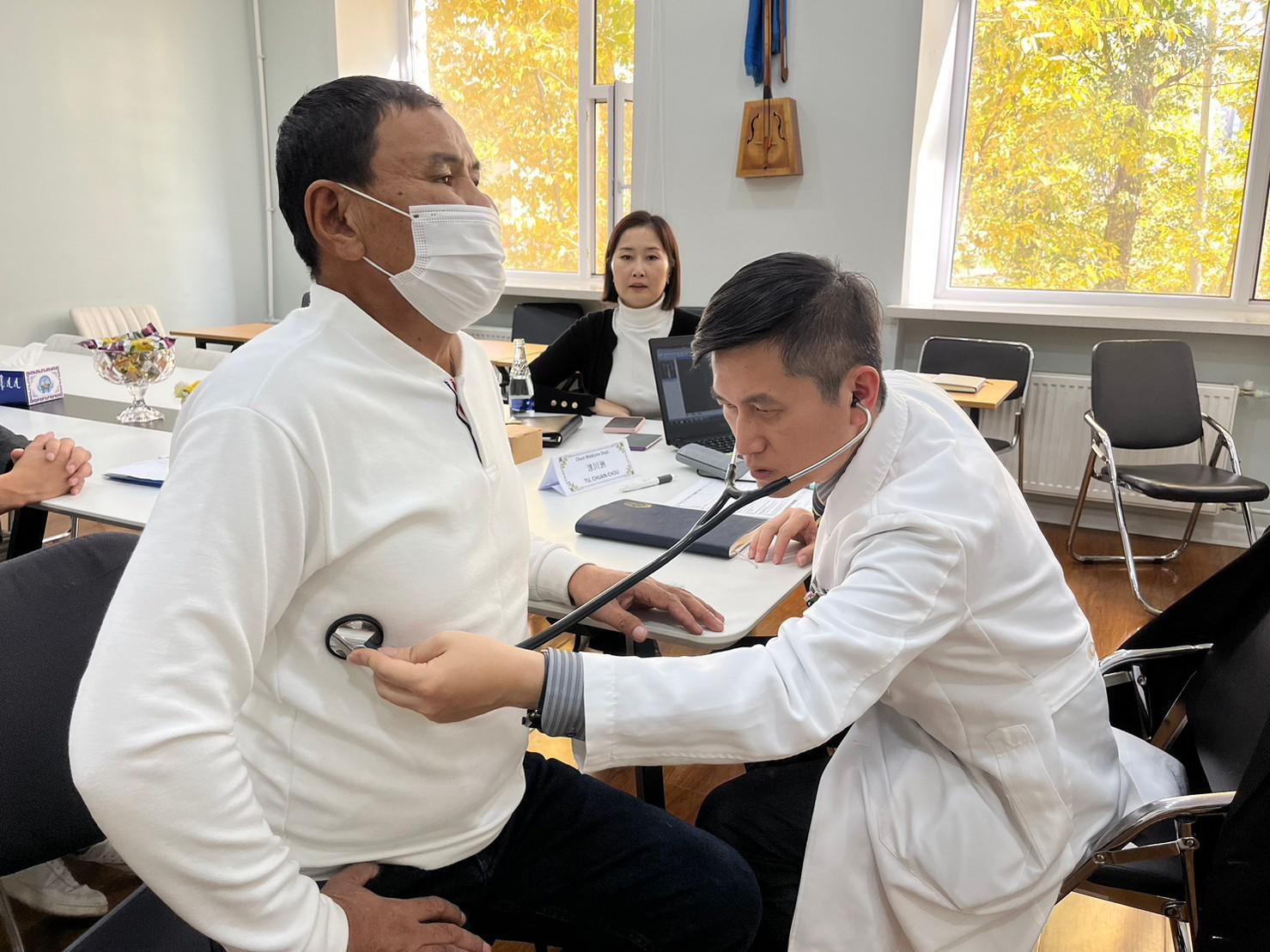 ▲蒙古因空氣汙染嚴重,肺癌患者很多,員榮醫療副院長、胸腔內科涂川洲醫師仔細為患者聽診。