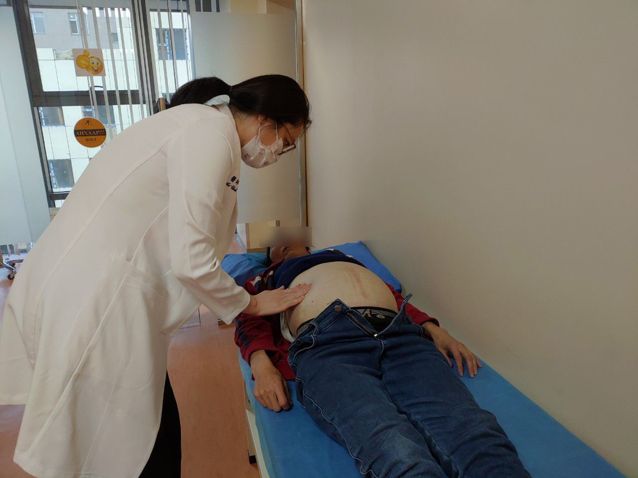 ▲一名蒙古中年婦人肚子腫脹一直查不出原因,接受義診團隊三總一般外科醫師馮安捷檢查。
