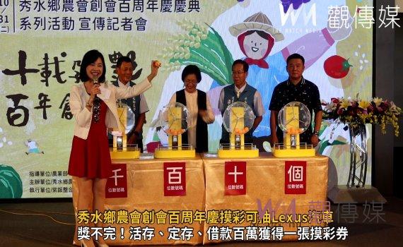 (觀傳媒彰化新聞)【記者陳雅芳/彰化報導】彰化縣秀水鄉農會晉升「祖父級」,秀水鄉農會今年創會100年,今(31)日於縣府中庭召開「十載孕晶艷.百年創禾稼」系列宣傳活動,農會總幹事吳明信宣布回饋農民,只要提出活存100萬元、定存200萬元、借款300萬都可以獲得一張摸彩券,一個人最多可以領10張,總共發出6678張摸彩券,共有1467個獎項,頭獎是價值170餘萬元的Lexus NX200汽車。