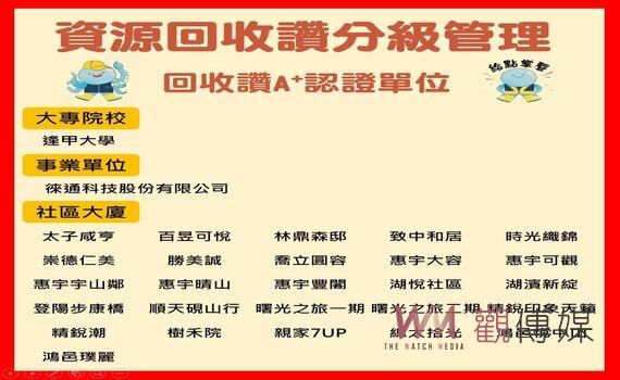 (觀傳媒中彰投新聞)【記者廖妙茜/台中報導】為達台中低碳城市願景,台中市政府環保局積極推動「資源回收讚分級管理計畫」,112年度再添28處生力軍,共26處社區、1處企業及1所大專院校通過「回收讚A+級」認證,成為台中市的績優示範單位,讓環保觀念扎根、擴散;獲獎名單請查詢網址 https://reurl.cc/qLGAdg 。
