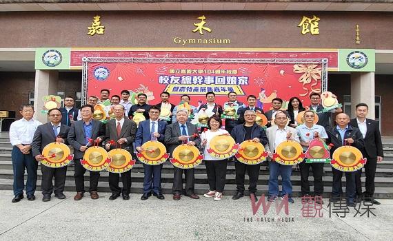 (觀傳媒嘉義新聞)【記者邱嘉琪/嘉義報導】嘉義大學歡慶104週年校慶,17日下午舉行校友總幹事回娘家活動,更創意結合嘉大聞名的農特產品舉行展售嘉年華,以創意行銷農業。嘉義大學傑出校友、嘉義市長黃敏惠也回到母校共襄盛舉,與農業部臺南區農業改良場長羅正宗、嘉義大學聯合校友總會理事長林國村及15位校友農會總幹事以敲響銅鑼儀式慶祝嘉大生日;嘉大員生消費合作社亦配合校慶活動發表第一支國產黑豆豆花及枝豆芋圓等新商品。