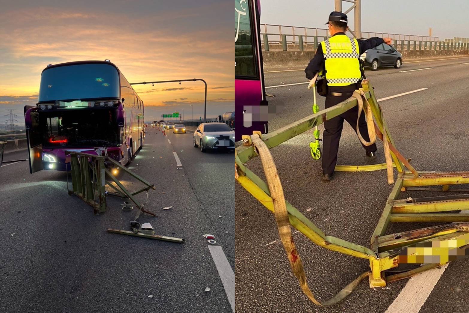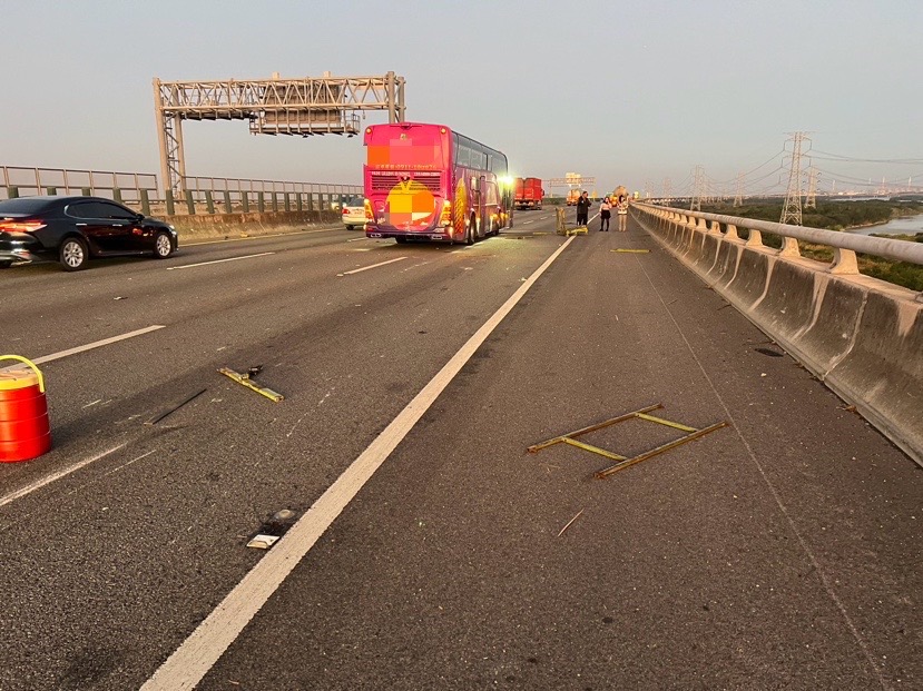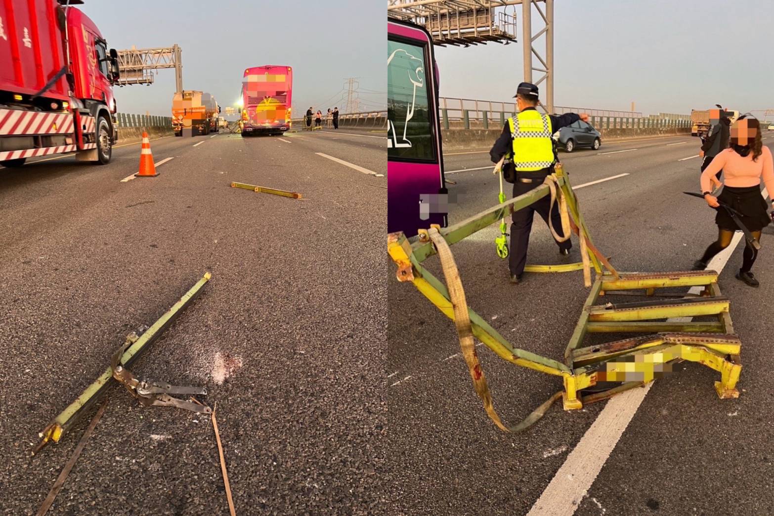 ▲國道3號高速公路北向彰化和美路段,一輛半聯結車的鐵架飛落車道,造成後方3車閃避不及撞上,其中1輛遊覽車左車頭毀損,幸未釀傷亡。