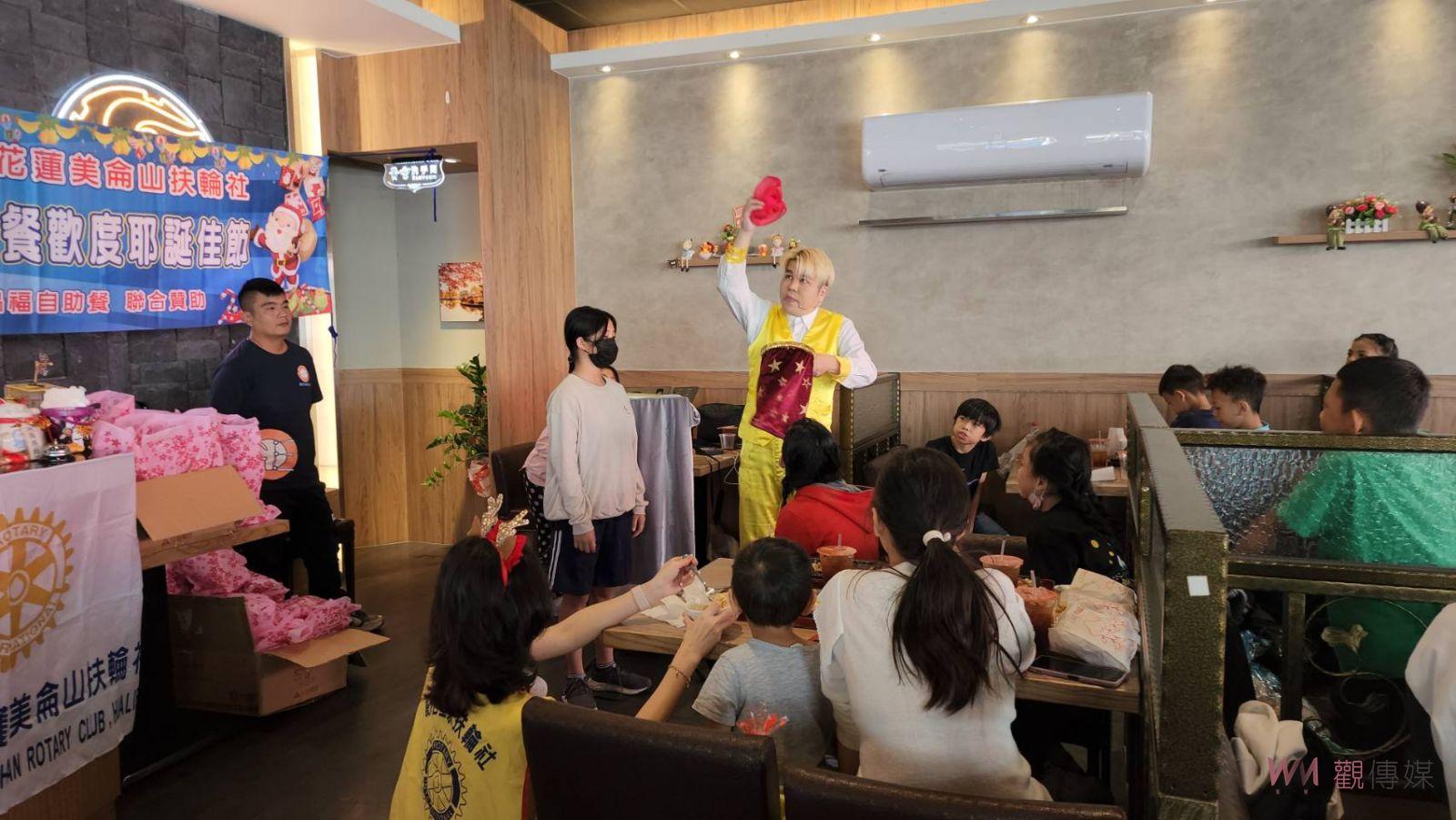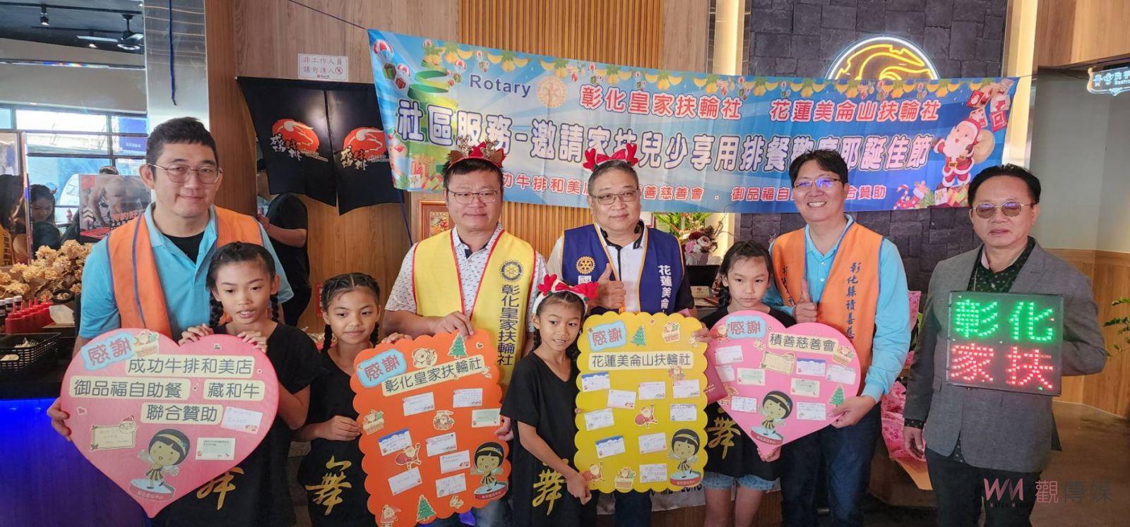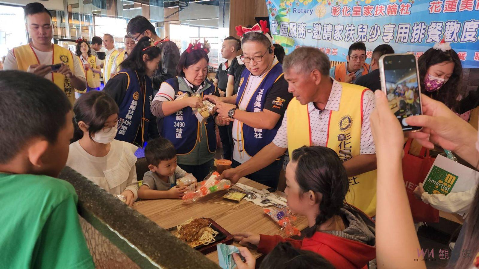 (觀傳媒彰化新聞)【記者陳雅芳/彰化報導】在耶誕節即將降臨之際,彰化皇家扶輪社與花蓮美侖山扶輪社今(18)日舉以「扶輪獻愛,家扶兒樂開懷」為主題,提前為彰化家扶中心的兒童們營造了一場溫馨感動的耶誕饗宴,招待彰化家扶親子60人享用排餐,並贈送在場的每一位小朋友們一份耶誕禮物,活動中並安排造型氣球及魔術表演與大小朋友互動,現場氣氛超嗨!
