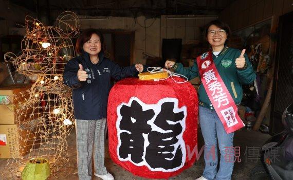 ▲勞動部長許銘春陪同彰化第二選區立委候選人黃秀芳在彰化市徒步掃街,也細心關心著當地店家趕工製作燈籠的情況。