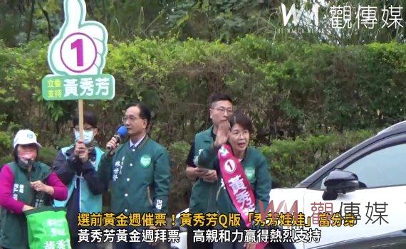 黃秀芳表示,從政以來,每次選戰她堅持打一場乾淨的選舉,不抹黑、不亂插旗、不亂拉布條,當然更不會賄選,她用選民服務與爭取地方建設,爭取鄉親認同,選戰最後衝刺,座談會、掃街、站路口都是同步進行,1天當3天用,仍是分身乏術,所以出動很受歡迎的Q版「秀芳娃娃」頭偶當分身,向選民揮手拜票。