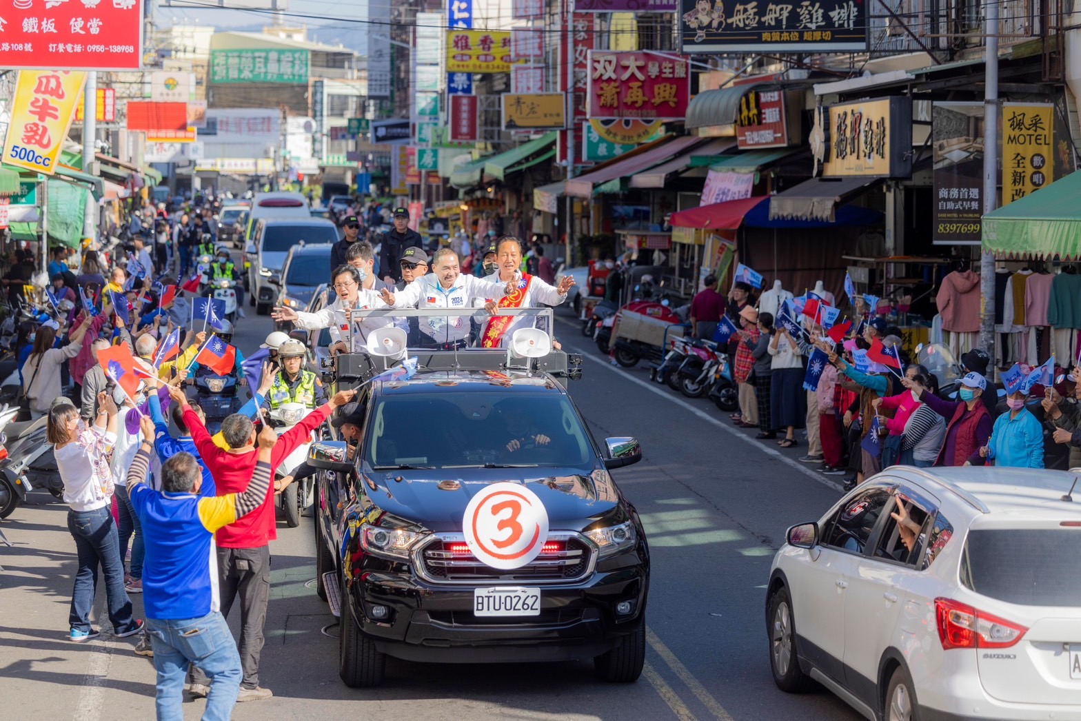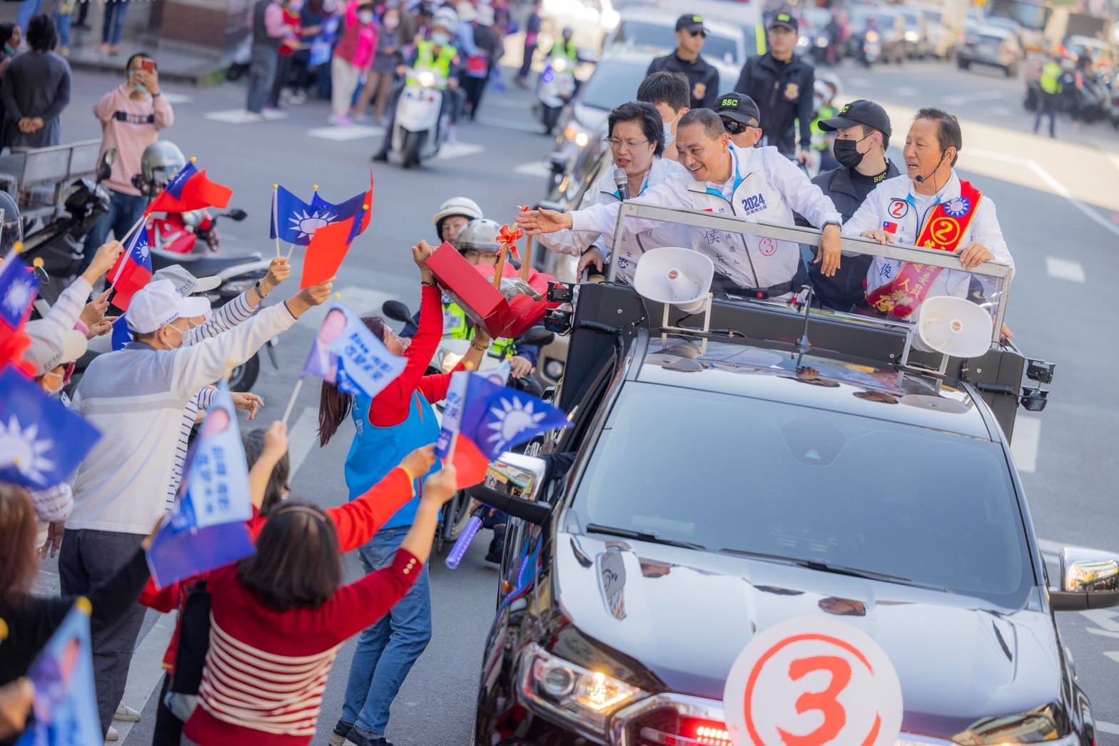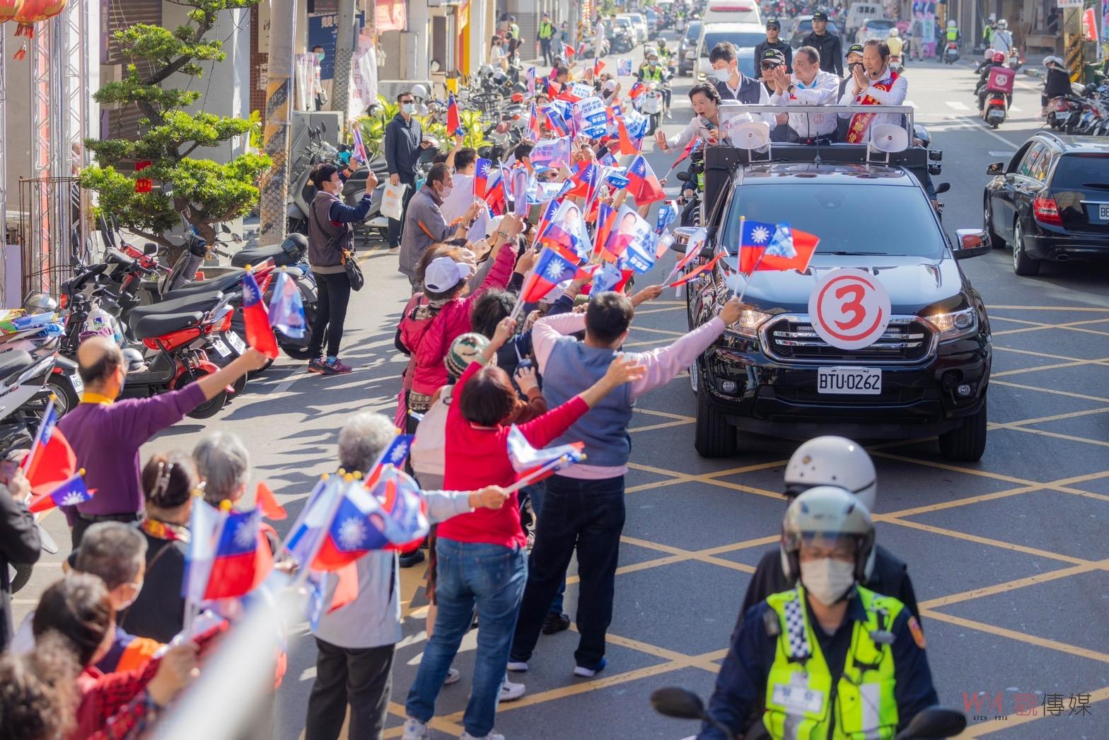 ▲國民黨總統候選人侯友宜到彰化縣為黨籍四名立委候選人站台助選及車隊掃街,沿途受到不少支持者歡迎,並燃放鞭炮。