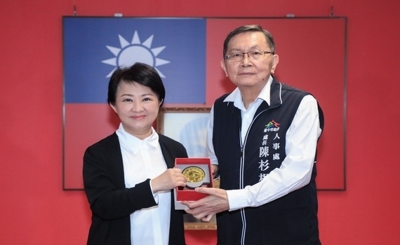 ▲台中市長盧秀燕頒贈人事處長陳杉根退休感謝狀及紀念品。(圖/台中市政府提供)