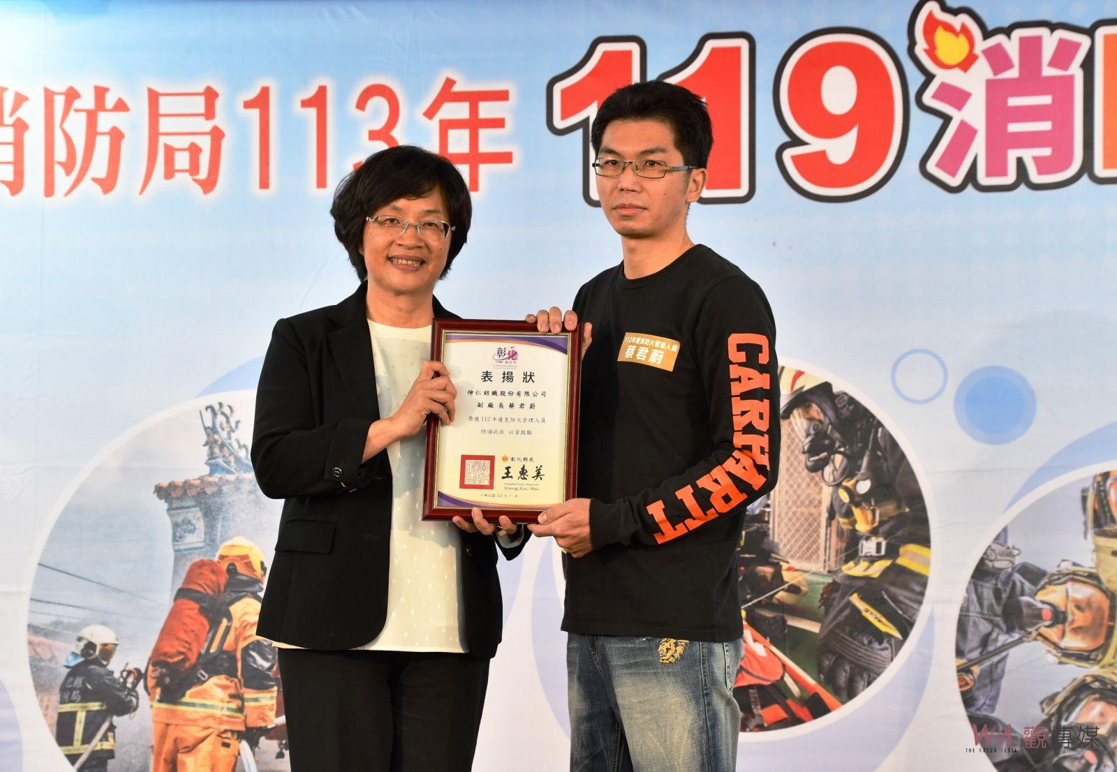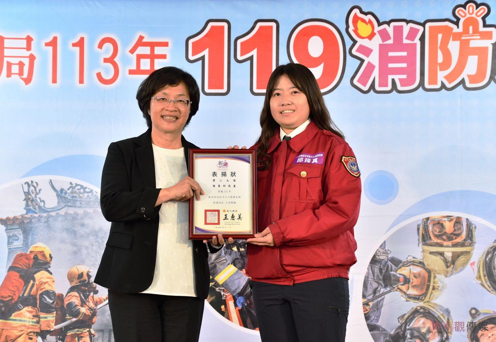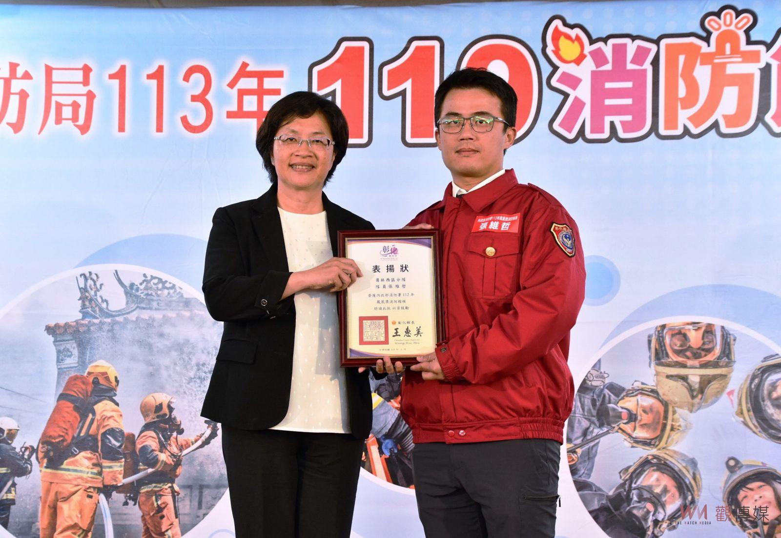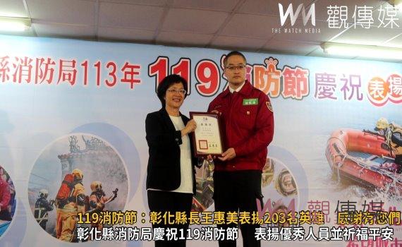 ▲彰化縣消防局在芳苑普天宮舉行119消防節慶祝表揚活動,彰化縣長王惠美頒獎表揚203位消防英雄。