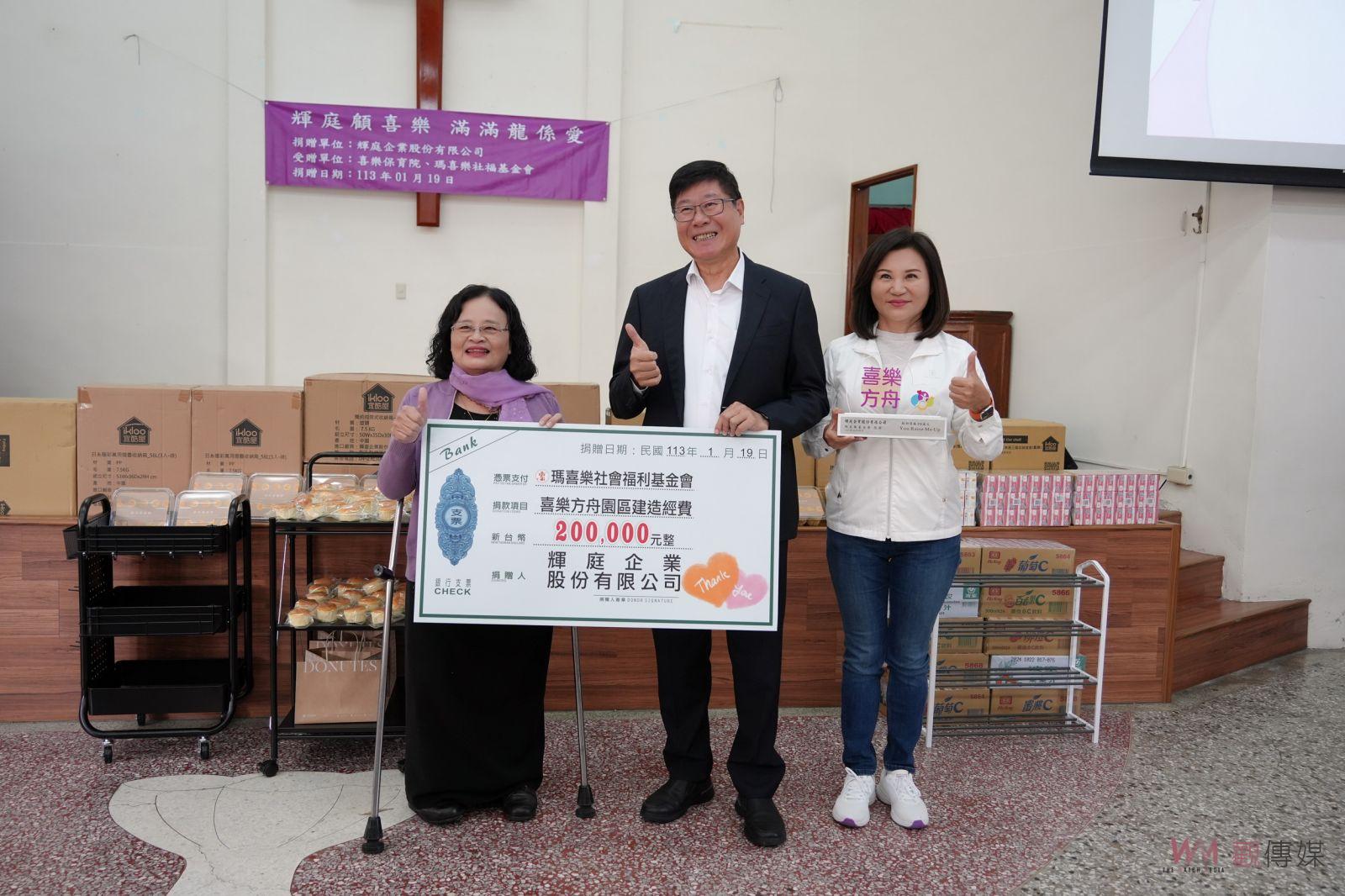 ▲彰化縣輝庭公司董事長蔡長銘捐贈居家收納產品給二林喜樂保育院,加碼捐贈二十萬元關懷金協助瑪喜樂基金會建廠計畫。