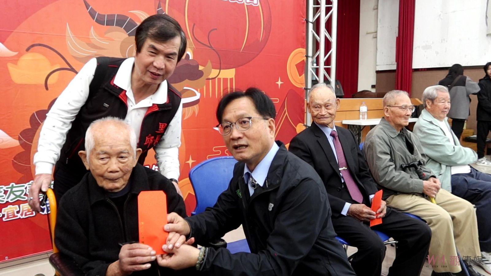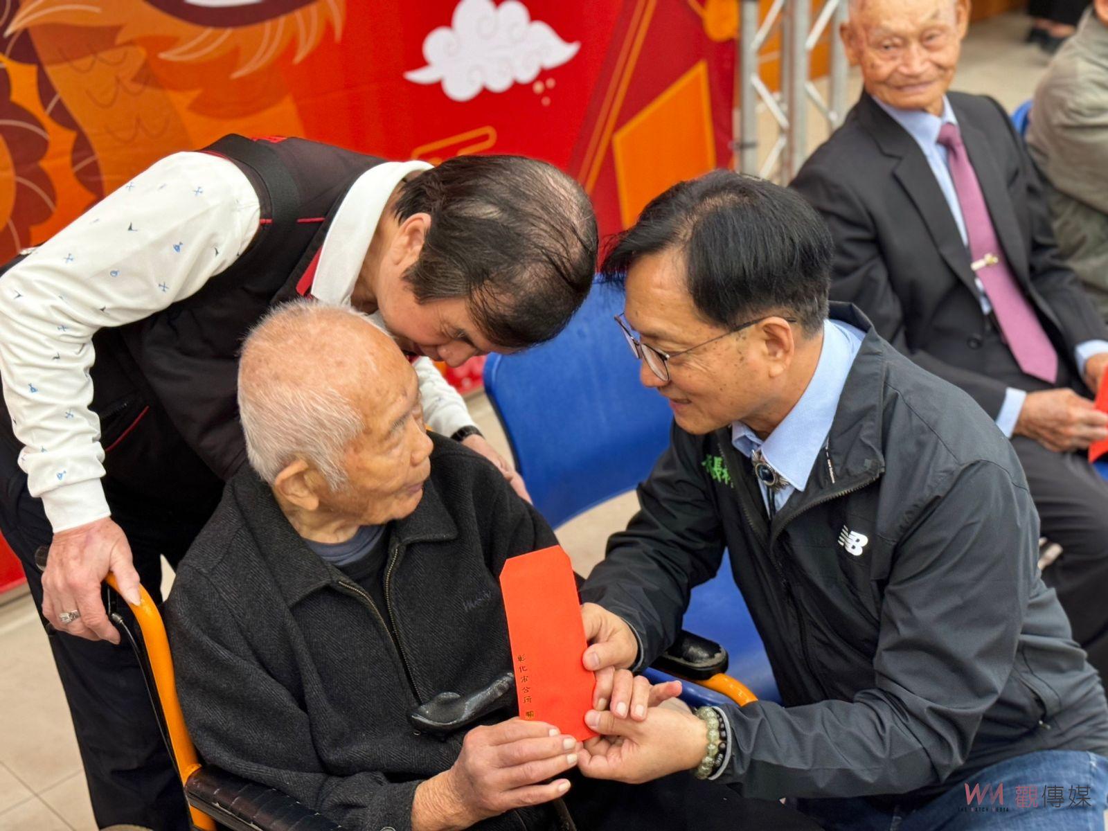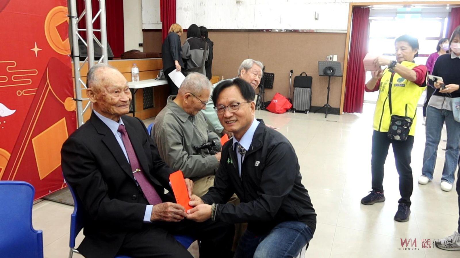 ▲彰化市公所將發放春節敬老禮金給設籍彰化市的70歲以長者,市長林世賢記者會上致贈春節紅包給103歲人瑞林文漢等長者。