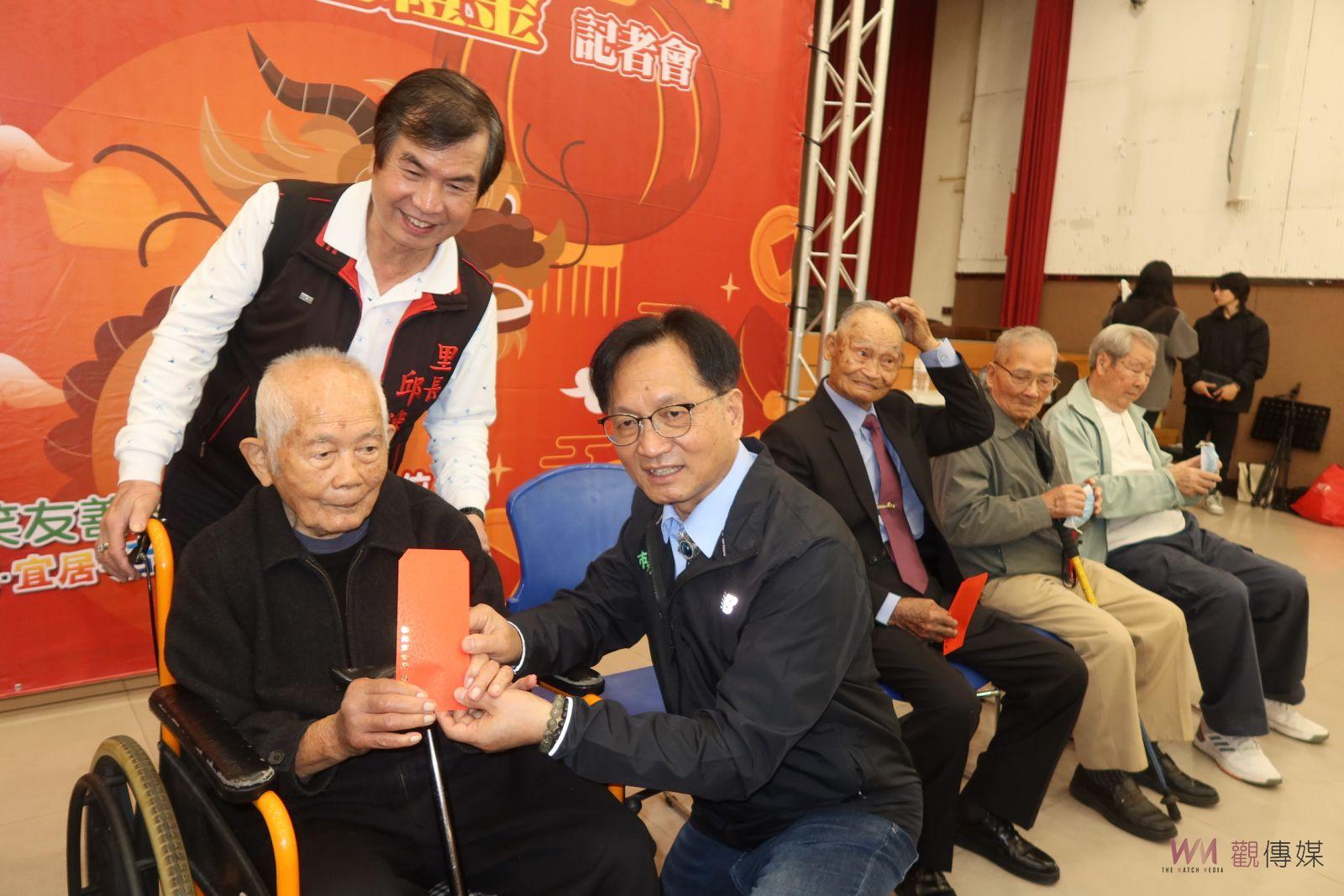 ▲彰化市公所將發放春節敬老禮金給設籍彰化市的70歲以長者,市長林世賢記者會上致贈春節紅包給103歲人瑞林文漢等長者。