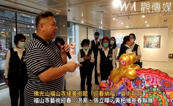 ▲佛光山福山寺緣美術館彰化館舉辦迎春納福聯展,邀請洪易、張立曄、黃柏維三位藝術家聯展,作品從色彩到祝福的寓意都充滿了歡喜。