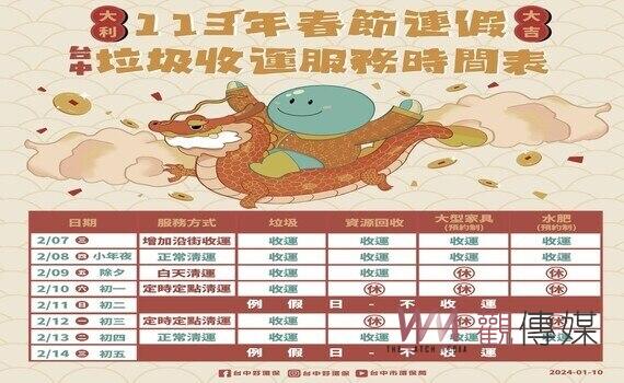 (觀傳媒中彰投新聞)【記者廖妙茜/台中報導】農曆春節7天連假將至,台中市政府環保局垃圾收運服務不打烊;2月8日小年夜及9日除夕均有沿街收運,大年初一(2月10日)、初三(2月12日)則採「定時定點服務」,讓民眾連假期間倒垃圾免煩惱。