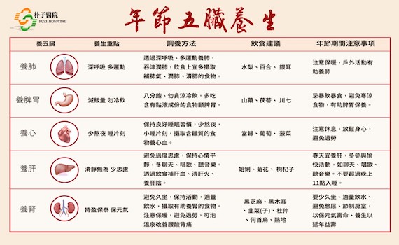 李博士提到,養心則少熬夜,小睡片刻:心主血脈和心藏神,是五臟中的君主之官。心血旺盛,則可見精神飽滿,思維清晰、聰明敏捷;但若心的功能失調,則會發生健忘、精神萎頓、思想反應遲緩等問題。因此保持心臟健康的第一步是確保良好的作息,少熬夜、足夠的睡眠時間,有助於提升心臟功能。春節期間應該多找時間及空檔休息、放鬆身心,此外,多攝取富含鐵質的食物,如當歸、葡萄、菠菜等,有助於補充心臟所需的營養。養肝宜清靜無為、少思慮:春天是四季之首,也是草木繁榮生發的季節;而肝臟在五行中所對應的為「木」,這就是為什麼春天宜養肝的道理。此外,天氣回溫時氣壓不穩,人的心情也容易煩躁不安,而不安會讓怒氣容易上升,因此這時期,疏(舒)肝解鬱也是重點。養肝的方法包括多參與愉快的活動,如聊天、唱歌、聽音樂,以疏解壓力。春節期間親友相聚可以聊些愉快的事情、緩和緊繃的身心,高歌一曲也不失為舒壓養肝、加強心肺功能的好方法,,避免過度思慮和情緒波動,有助於保護肝臟健康。飲食上可攝取蛤蜊、菊花、枸杞子等食物,補充肝血、清肝火、養肝陰。