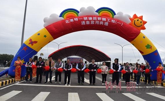 (觀傳媒雲林新聞)【記者洪佳伶、蘇榮泉/雲林報導】北港朝天宮及武德宮香火鼎盛,逢春節、例假日及廟會期間,自外地湧入大量遊客及香客,造成市區交通嚴重壅塞。為強化北港鎮東西向道路交通系統,紓解道路交通壅塞問題,達到分流的效果。北港最大的東西向40米大道,北港特一號道路於各級民意代表及政府通力合作下,完成連接縣道145線至155線一期工程,今(5)日舉行通車典禮,由北港鎮長蕭美文、國土管理署副總工程司蘇建隆、交通工務局局長汪令堯、議員黃文祥、鎮民代表主席黃美蘭等人主持。