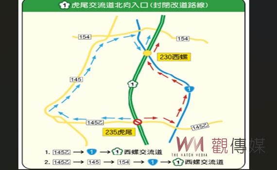 連假期間,自2月12日至2月14日每日12時至21時,國道高速公路局將封閉虎尾交流道北上入口匝道。建議用路人可採取替代道路行駛: