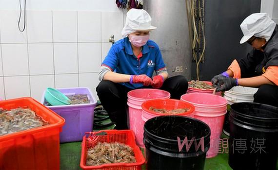 ▲小萍(左2)表示同事們都很友善,不僅有條理地指導剝蝦技巧,還耐心地聆聽她的問題。