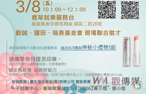 朴子就業中心表示,三八婦女節徵才活動,邀集勤誠興業股份有限公司、國田興業有限公司與瑞泰基金會3家廠商參與徵才,釋出品管員、物料員、技術員、作業員、居服督導員、居服員及個管員等多項職缺。因適逢38婦女節,而女性重返職場的關鍵因素在於「建立自信心」,活動現場將發送慶生堂化妝品公司所提供的唇膏給面試民眾,讓每位求職民眾都能展現好氣色,在面試時留下好印象,幫助在求職過程中更加順利。