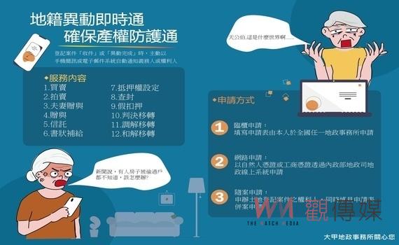 (觀傳媒中彰投新聞)【記者廖妙茜/台中報導】在全民防詐的時代,不動產也有防詐利器,內政部推出地籍異動即時通服務,讓民眾隨時掌握不動產登記異動情形,有效防範偽冒不動產移轉情況。除了可至地政事務所臨櫃免費申請外,為服務居住在大安溪以北較遠的民眾,台中市大甲地政事務所在日南慈德宮附近的大甲區公所日南地區服務中心,派駐人員受理申請該服務,歡迎民眾多加利用。
