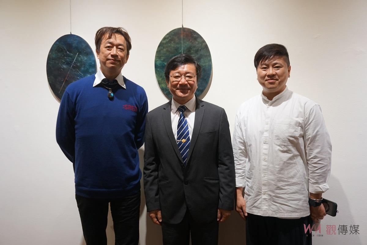 ▲虎科大展出曾景斌創作個展。(左起)藝術中心主任李彥希、校長張信良、藝術家曾景斌。