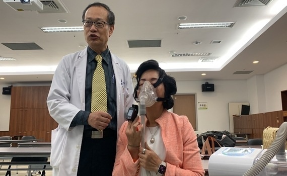 ▲醫師鐘威昇示範患者配戴正陽壓呼吸器治療。