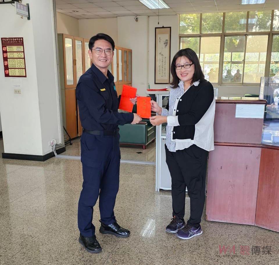 ▲田中警分局長簡龍宏與警友辦事處副主任陳瑞德共同贈送每位女性員工禮卷,慰勞並祝賀婦女節快樂。