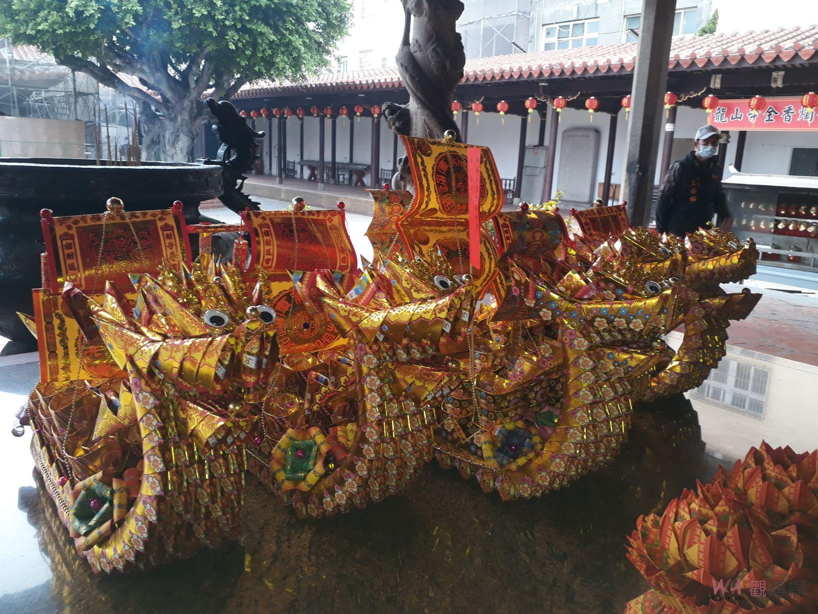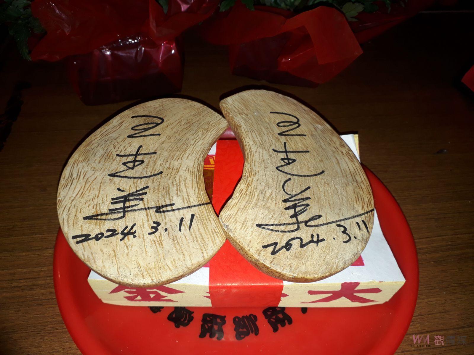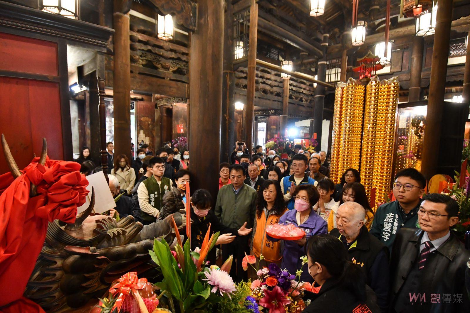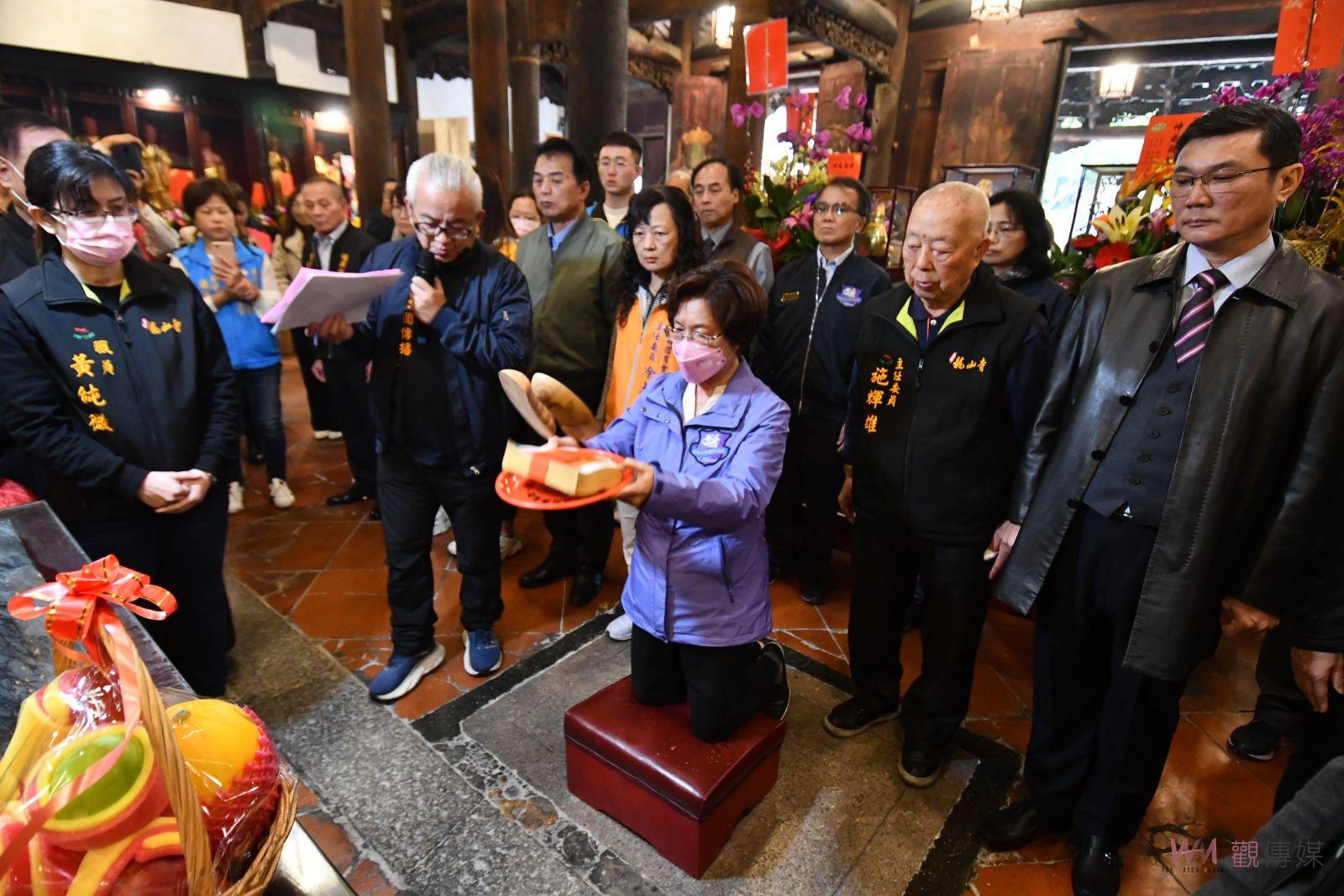 ▲彰化縣長王惠美前往龍山寺向觀世音菩薩及龍王尊神擲筊請示「龍王祭」活動辦理日期,擇定5月12日為「2024鹿港慶端陽-龍王祭」活動及龍舟下水典禮主法日期。