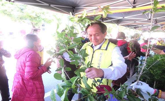 12日當天,鎮公所與台一種苗及南投縣政府合作,救國團埔里團委會協助下於上午10時鎮長廖志城在埔里鎮公所大門口發放一千多株苗木,樹苗種類有:金毛杜鵑、茶花、桂花、細葉仙丹及台一種苗場贊助提供七里香,每人以領取兩株為原則,民眾非常踴躍。(圖/記者石振賢攝.2024.03.12.)
