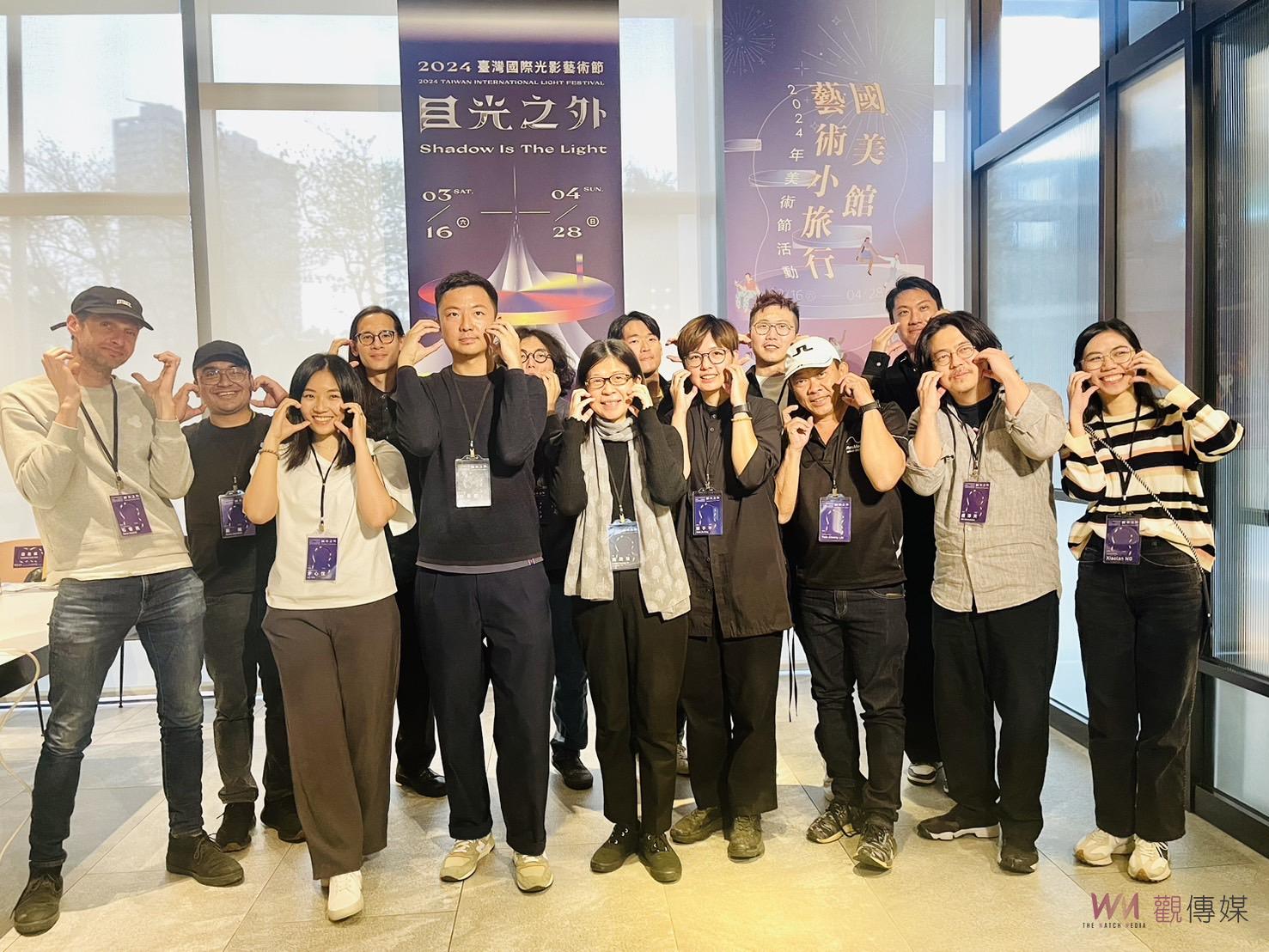 ▲「2024臺灣國際光影藝術節」今(15)日舉辦記者會,國美館長陳貺怡(前排左四)、策展團隊代表林長叡(前排左三)與藝術家合影。