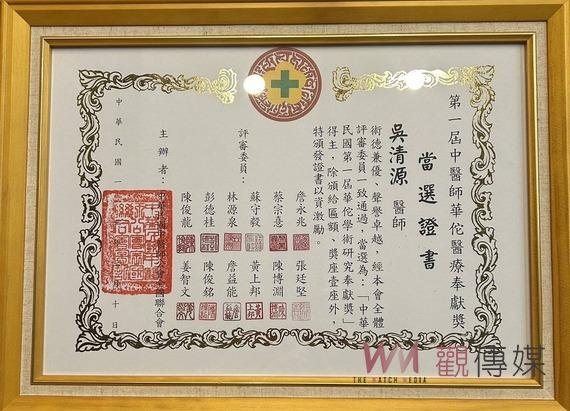 ▲嘉義長庚醫院中醫科醫師吳清源致力中醫學研究表現傑出,獲得頒發「第一屆中醫師華佗醫療奉獻獎」學術研究奉獻獎。
