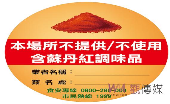 市政府說,為市民提供更嚴謹的食安保障,現於衛生局網站提供連結(https://gov.tw/oWv),鼓勵業者自主檢視及自主管理後,如無食安疑慮可自行下載「本場所不提供/不使用含蘇丹紅調味品」標誌並自行張貼,讓民眾知悉及安心消費。