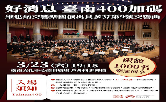 市政府文化局指出,2024適逢「臺南400」,臺南國際音樂節特別邀請維也納交響樂團來臺南,3/23(六)晚將帶來「貝多芬第9號交響曲」等精彩曲目。透過悠揚的樂章,不僅歌頌生命、和平及對世界的大愛,也呈現400年來,各不同族群在臺南互相碰撞、交同、融合、共創榮景的過程。