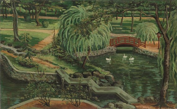 ▲翁崑德,〈公園(橋2)〉,1943年,油彩、畫布,72.3 x 99公分。