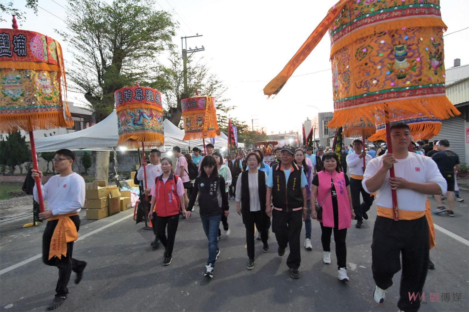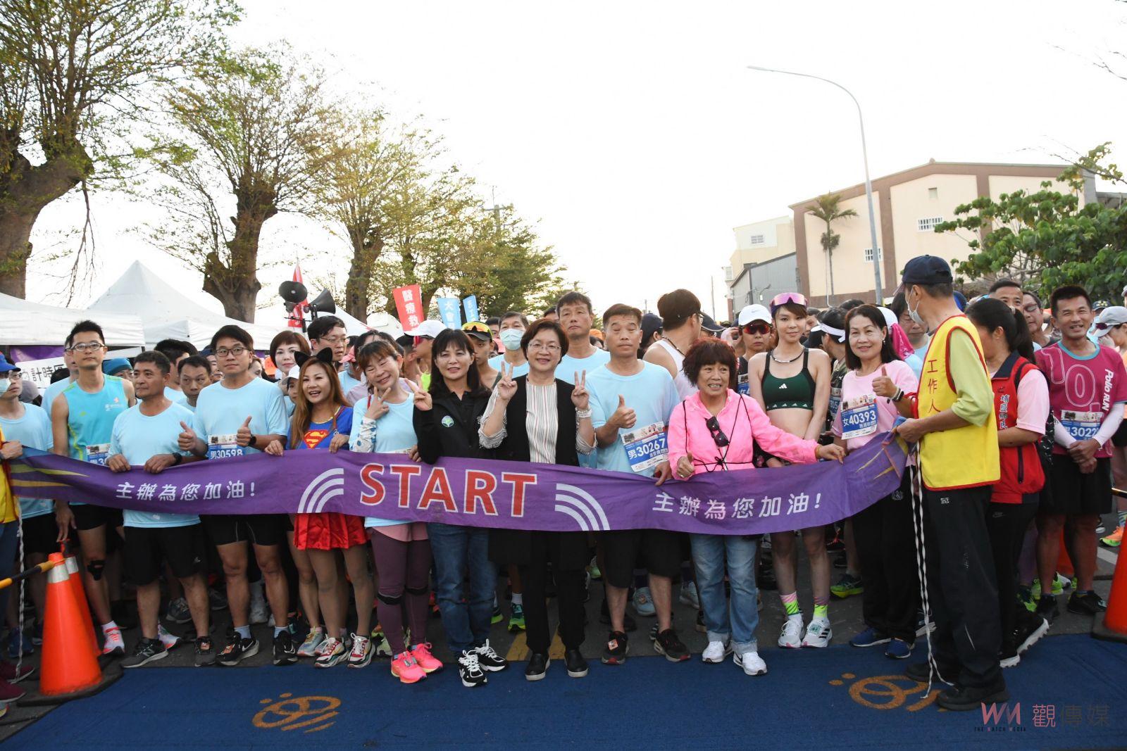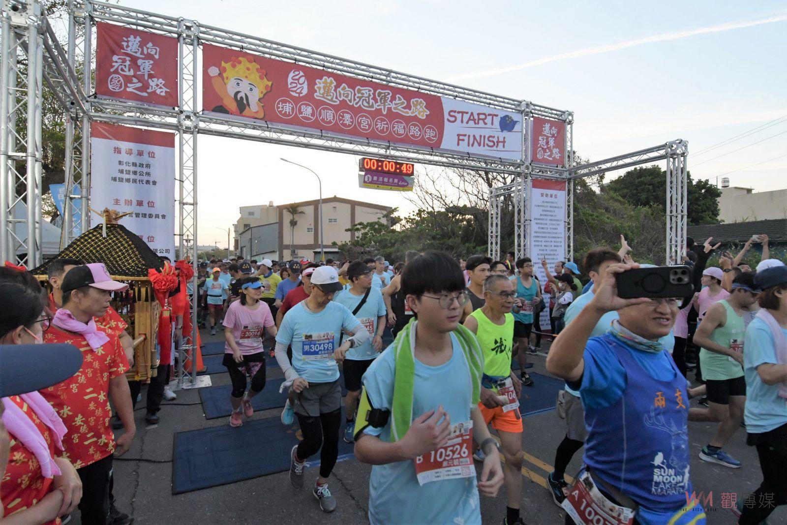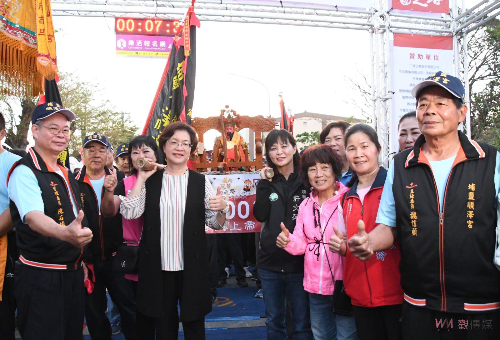 ▲埔鹽鄉順澤宮「邁向冠軍之路」祈福路跑開跑,由彰化縣長王惠美、埔鹽鄉長許文萍和順澤宮主委魏信顧等人共同鳴槍起跑,神轎也伴隨著選手們一同前行。