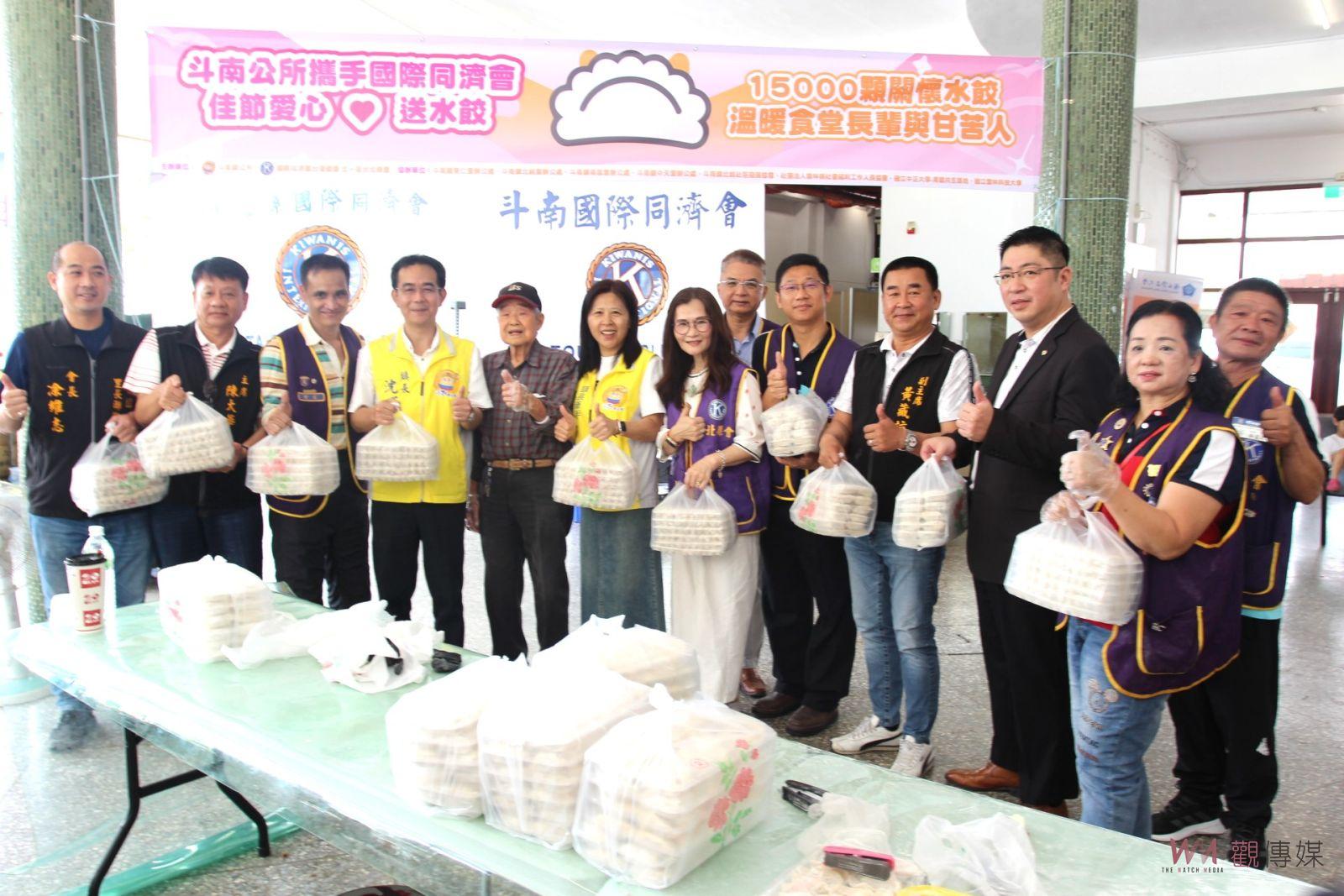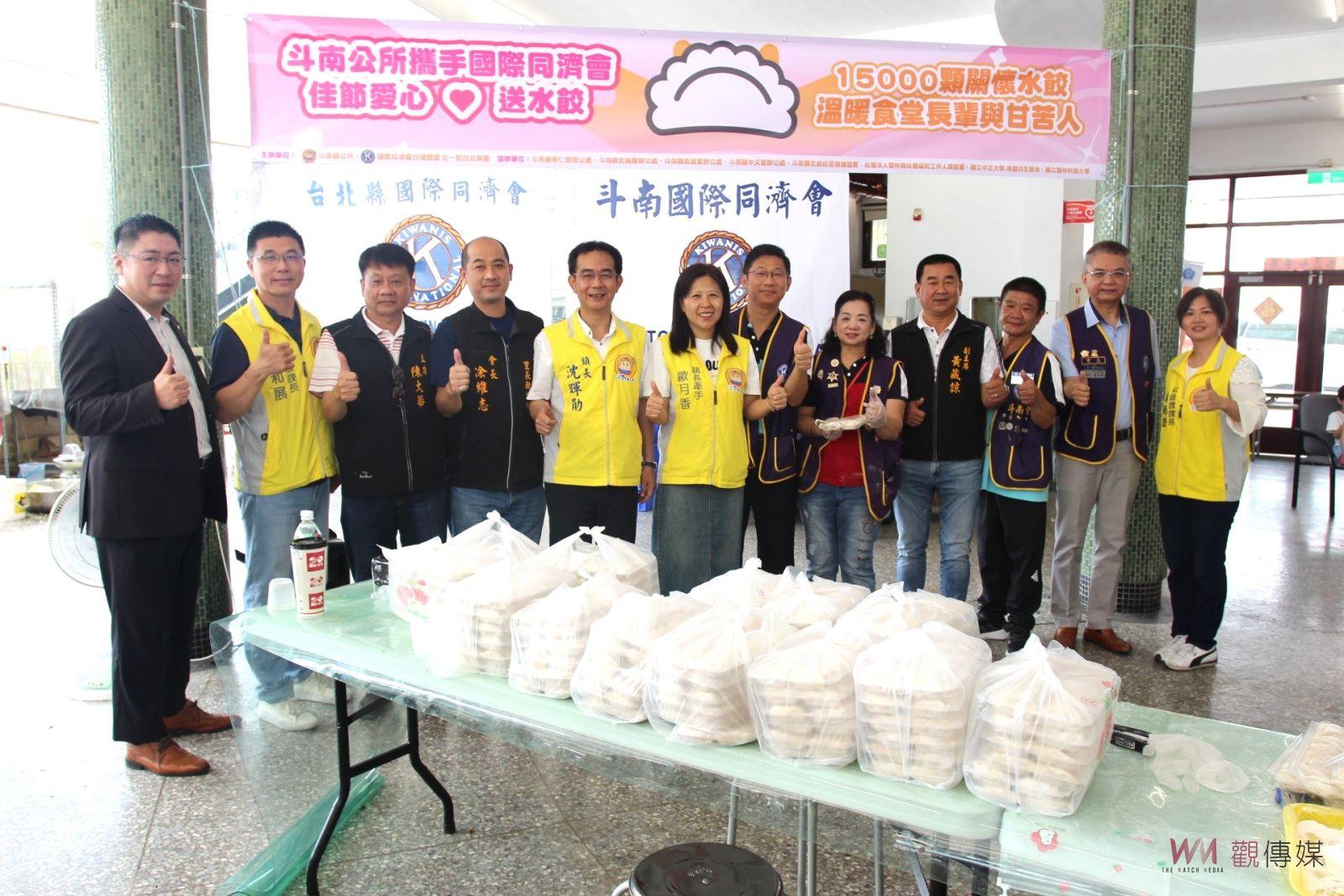 國際同濟會台灣總會北一區台北縣會秘書長沈憶君是斗南在地女兒,自去年10月起與鎮公所攜手善心促成這次的愛心水餃活動,並獲得台北縣會全力支持與協助,同時由羅世洪董事長捐贈全自動的包水餃機與攪拌機,加快製作水餃的速度;並在今(30)日上午,由同際會北一區台北縣會會長陳耀郎,率領幹部志工們從台北前來斗南舊台汽車站青銀共生基地,齊心協力包做1萬5千顆水餃,送給斗南長青食堂的長輩和甘苦的民眾,以致力發揚關心弱勢族群的同濟精神。