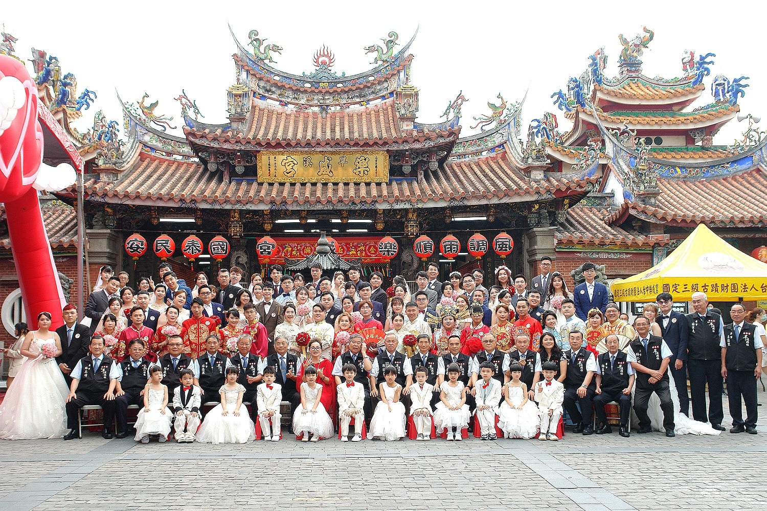 樂成宮第七屆集團結婚今天在民政局吳世瑋局長代表盧秀燕市長和數位治理局林谷隆局長、東區公所吳忠聖區長、黃燕姍代主秘、東區戶政喻梅芝主任、立委何欣純、羅庭瑋、議員李中及各級民意代表主任、助理、蒞臨指導,樂成宮董事長何敏誠帶領全體董監事參與,旱溪媽祖守護您幸福到老,活動從地球村幼兒園小朋友的熱情表演,帶動現場歡樂氣氛和滿滿的祝福。