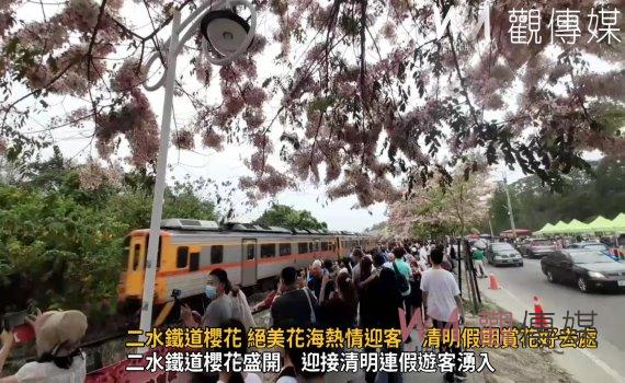 (觀傳媒彰化新聞)【記者陳雅芳/彰化報導】媲美阿里山鐵道櫻花的美景,就在彰化二水152縣道源泉段「二水鐵道櫻花」,粉嫩花旗木,隨風搖曳,鐵道旁的自行車道上塞滿大批遊客,當火車通過剎那,快門聲喀擦喀擦響起,絕美花卉搭配火車呼嘯而過,火車通過剎那,快門聲喀擦喀擦響起,讓人感受的百分百的美。