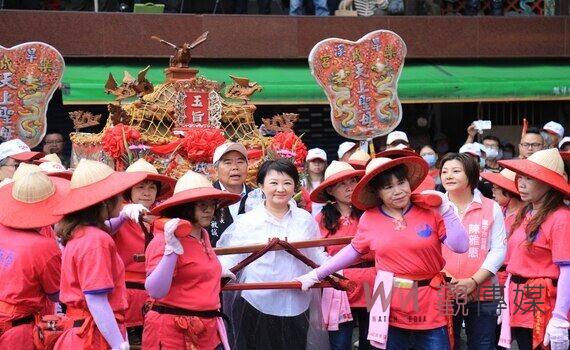 ▲市長盧秀燕與樂成宮董事長何敏誠,恭送旱溪媽祖起駕。