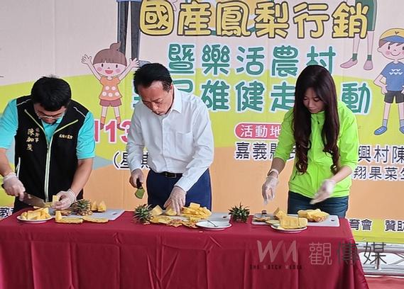 ▲民雄鄉是金鑽鳳梨最早推廣的起源地,縣長翁章梁盛讚嘉義縣鳳梨各品種風味,香甜好吃很合日本人的口味。