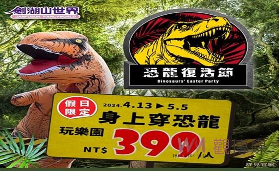 劍湖山世界經理張華紋表示,四月連假結束後,於4/13上午11點限定,推出「集合啦!恐龍宗親會」之逗趣踩街活動,將有各式各樣的恐龍來到園區同樂,宣告「恐龍復活節」正式開跑。於4/13至5/5期間,推出假日限定專案,只要穿著全身充氣恐龍裝或衣服、褲子上有恐龍圖樣者,到劍湖山世界,即可享本人門票399元的優惠。此外,4/13和4/14兩日,特別加碼開放大碗公、龍捲風、大船塢等三項水上設施,可以盡情水陸FUN玩。